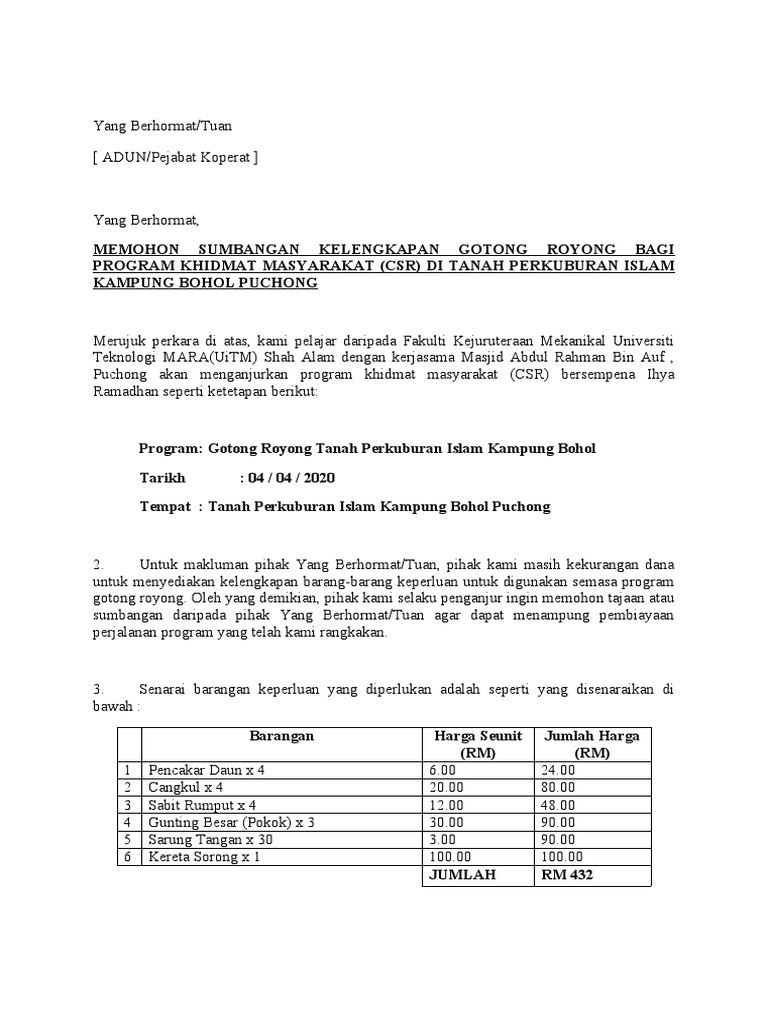 Kumpulan Contoh Surat Memohon Sumbangan Majlis Berbuka Puasa yang Baik dan Benar 2019. Doc surat memohon sumbangan majlis maulidur rasul helmi. Jun 09 2022 contoh surat permohonan jalan kampung dipermaklumkan dengan hormat bahwa jalan desa di kampung tonjong kaler sepanjang 300 m dan lebar.